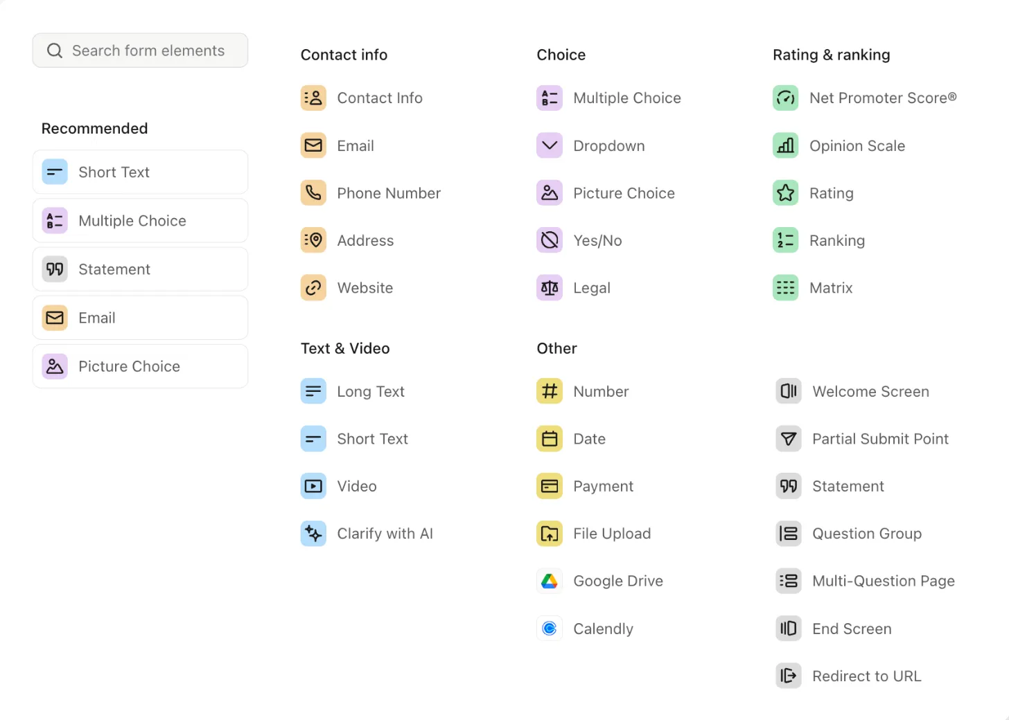 Look at the 30+ question type choices you have with Typeform, including the partial response point that lets you collect answers up to that point, even if users don't submit their forms (available on Core Plus and higher plans). Jotform doesn't offer this feature.