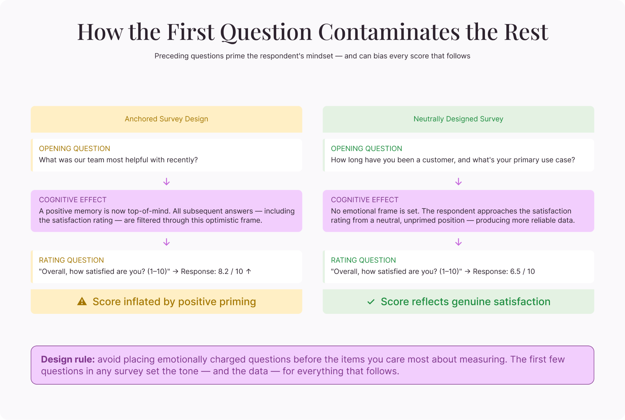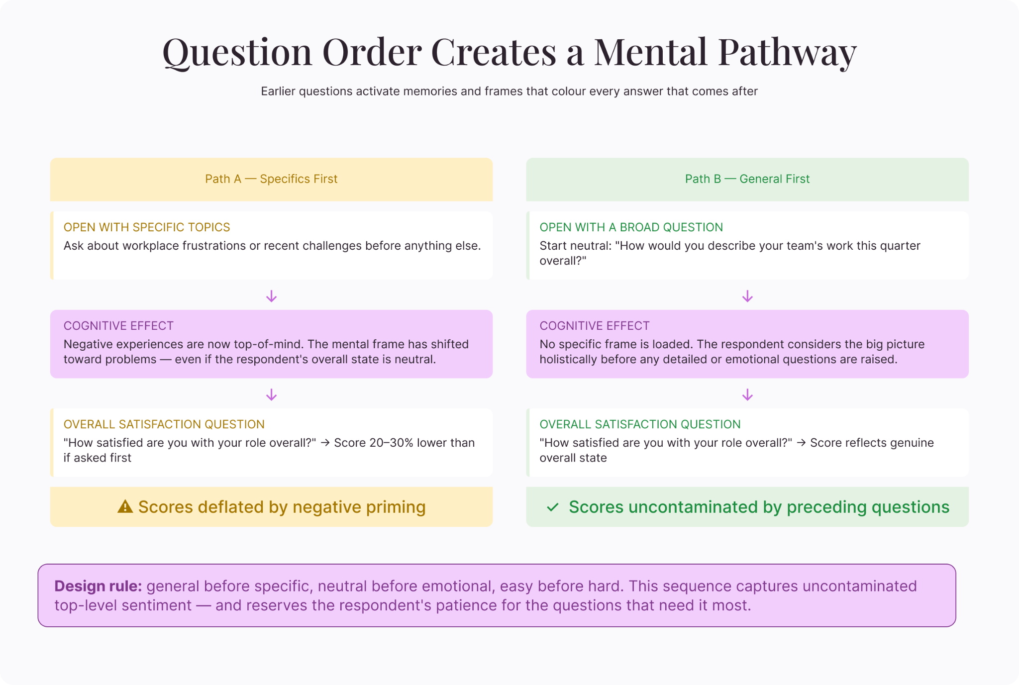 Design implication: Lead with broad, general questions before diving into specifics. This captures uncontaminated top-level sentiment. Then move to specific dimensions. Save sensitive or emotionally charged questions for later, after the respondent is engaged and the survey has established a neutral tone.