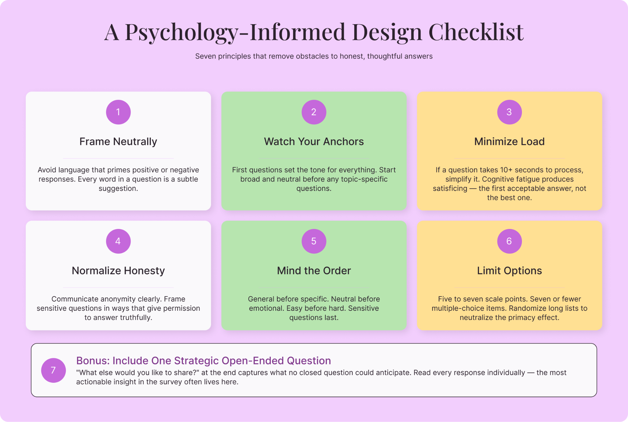 Understanding the psychology behind how people respond to questions doesn't require a degree in cognitive science. It requires recognizing a handful of well-documented mental patterns and designing around them. When you do, you get data that's more honest, more complete, and more useful than what a naively designed survey would produce.