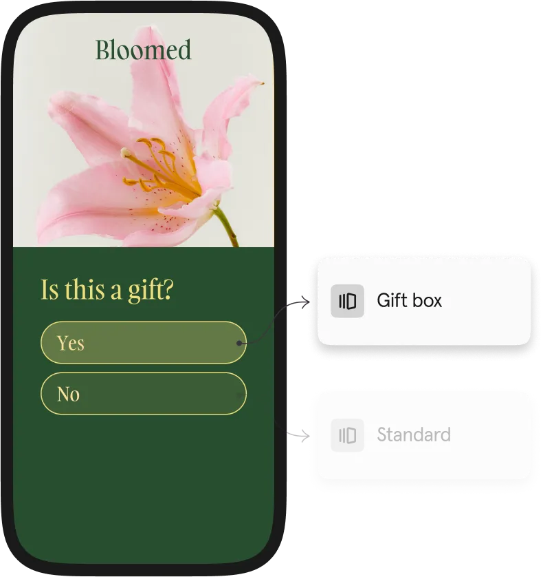 Once someone selects their bouquet, you can ask them if it's a gift to direct them to the right follow-up questions about packaging and a message for the card. Without logic, quiz-takers would have to skip through the questions, adding unnecessary friction.