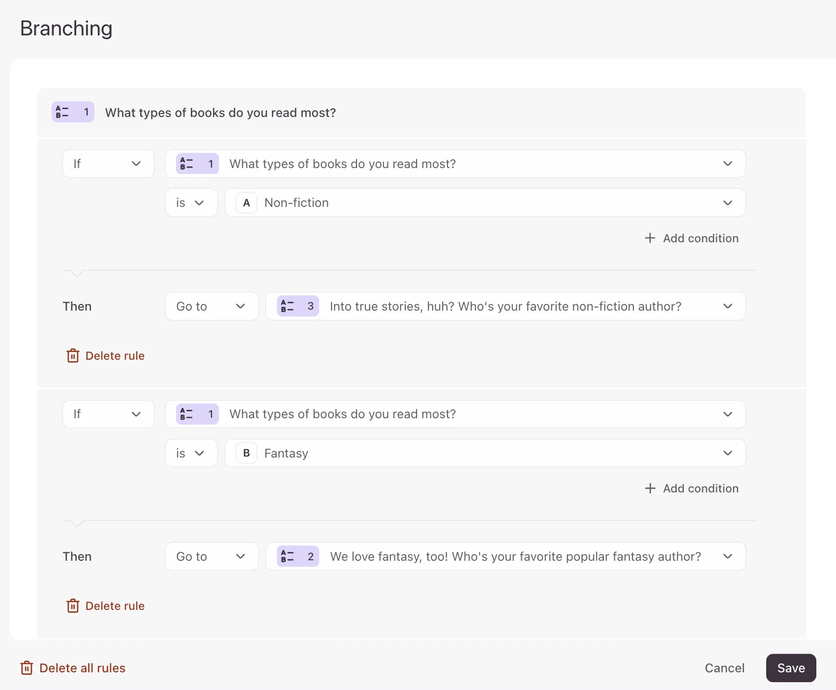 If a survey-taker tells you they only read fantasy, you wouldn't want to ask a bunch of follow-up questions about the other genres. So you set up logic to make sure they only see questions about fantasy books.
