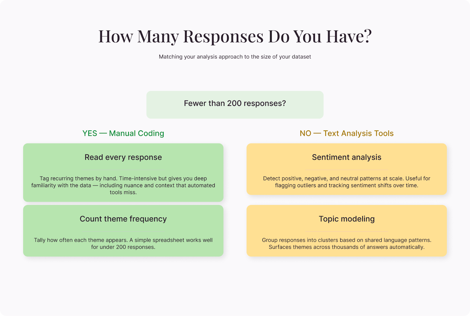 For smaller datasets (under a few hundred responses), manual coding works well. Read every response, tag recurring themes, and count how often each theme appears. This process is time-consuming but gives you an intimate understanding of the data.