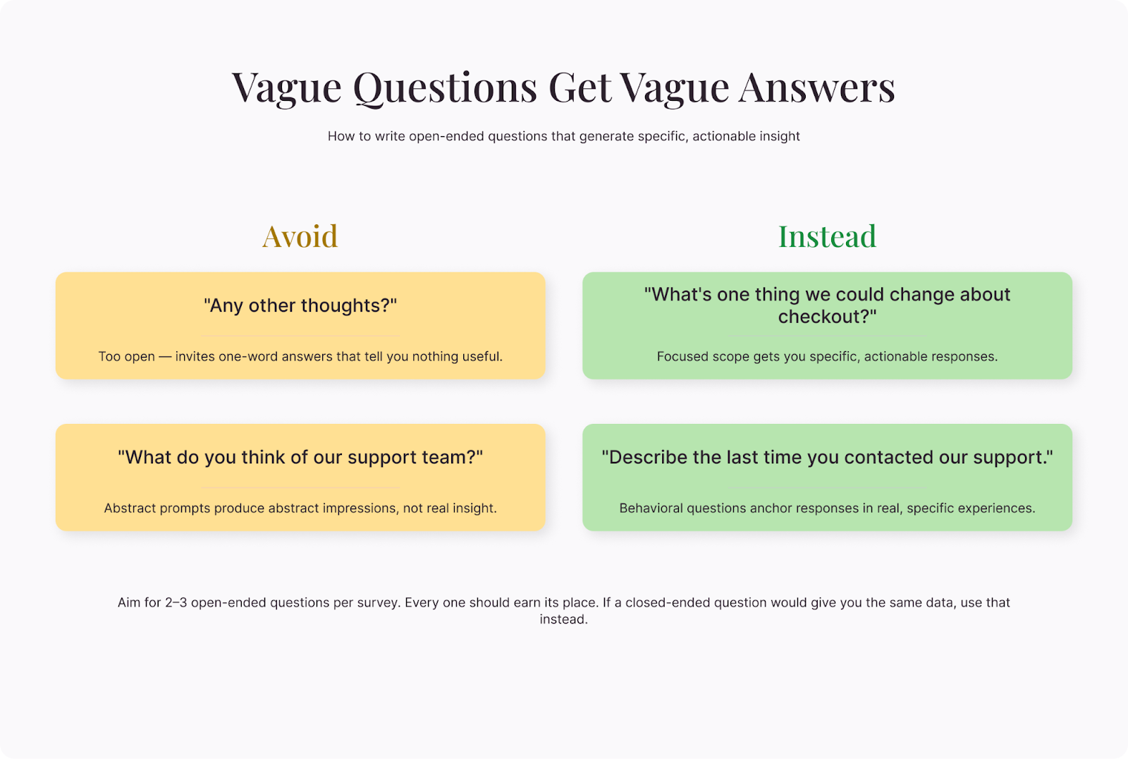 Ask about behavior, not just opinions. "Tell us about the last time you contacted customer support" generates richer responses than "What do you think of our customer support?" Behavioral questions ground responses in real experiences rather than abstract impressions.