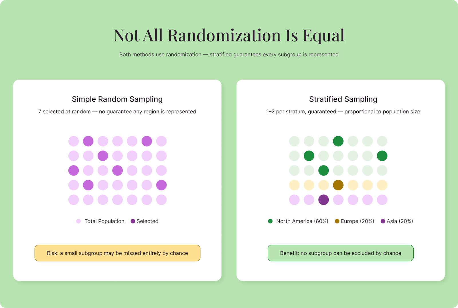Drawback: If important subgroups are small, random chance might exclude them entirely. A 5% minority in your population might not show up at all in a sample of 100.