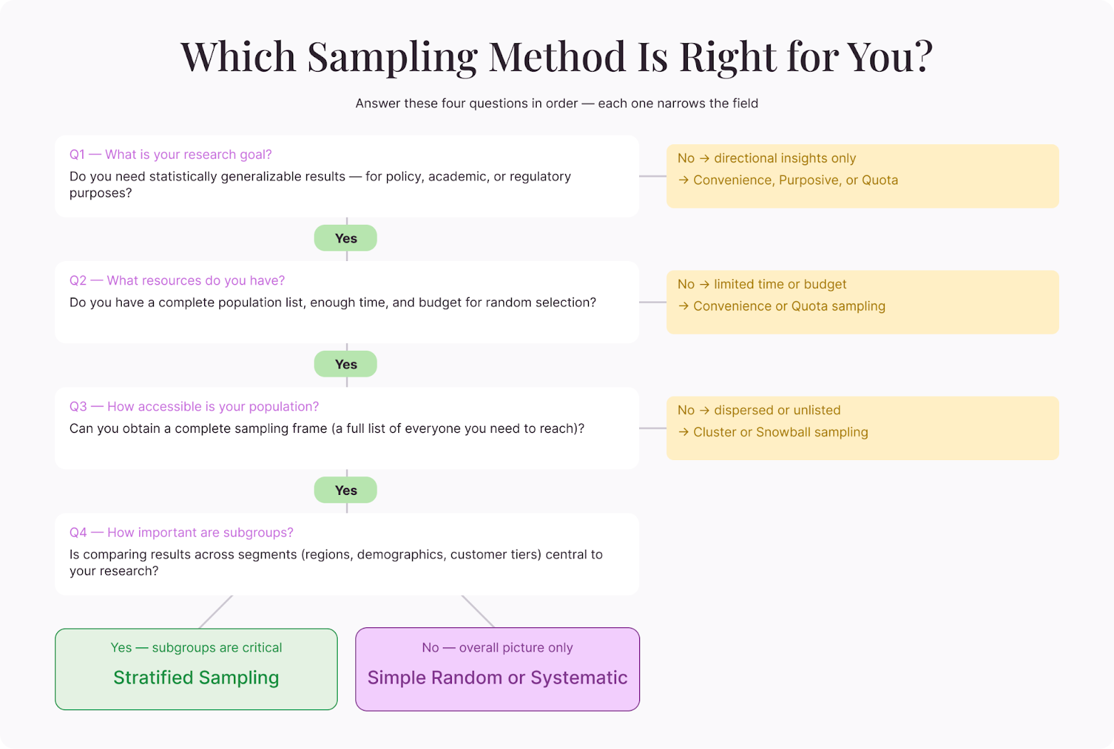 How important are subgroups? If comparing results across segments (regions, demographics, customer types) is central to your research, stratified sampling ensures each segment is adequately represented. If you just need an overall picture, simpler methods work.