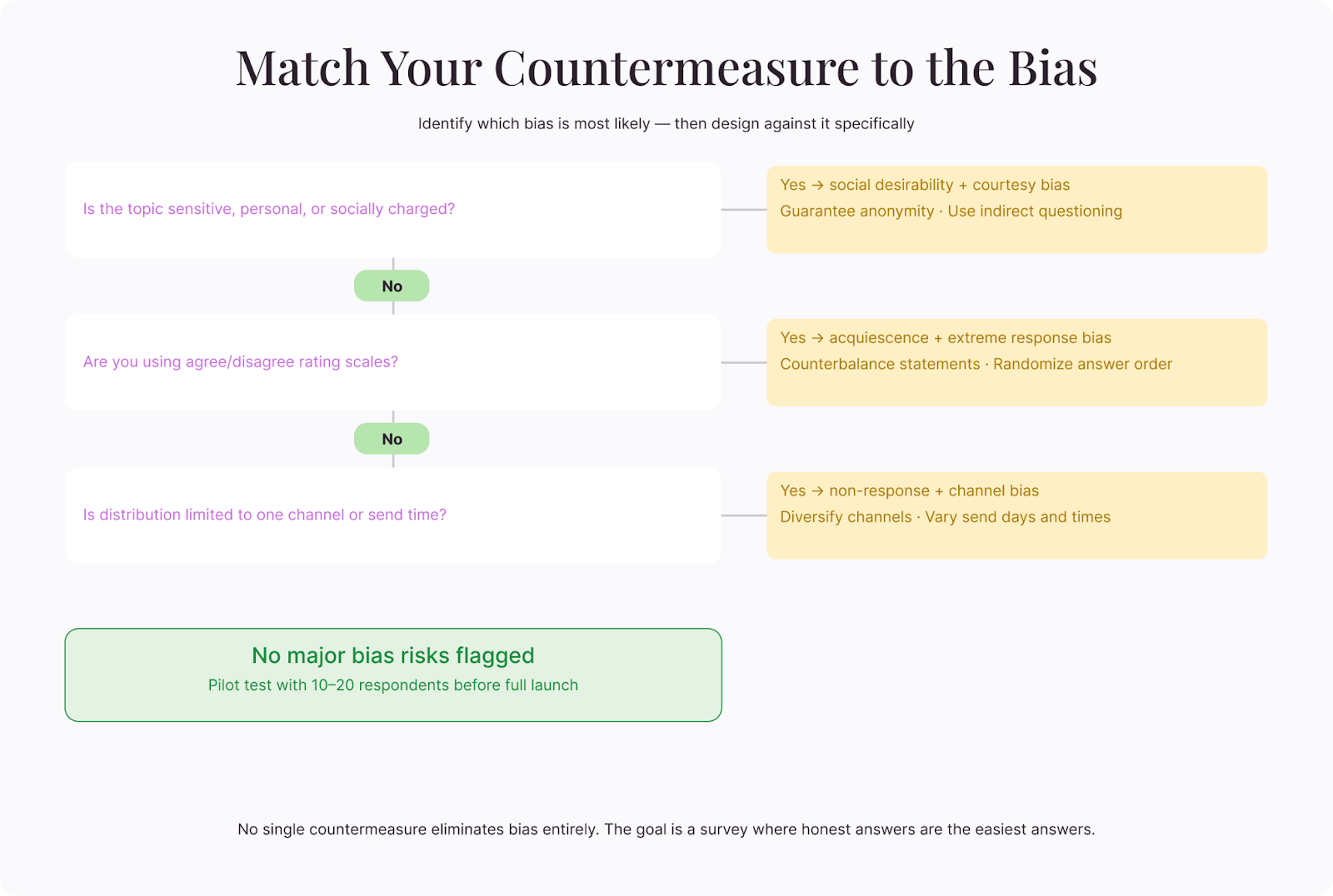 Response bias will never disappear completely. Humans are complicated, and the act of asking questions inevitably changes the answers you get. But a thoughtfully designed survey—one that anticipates bias and builds in countermeasures—gets you close enough to the truth to make decisions you can trust.