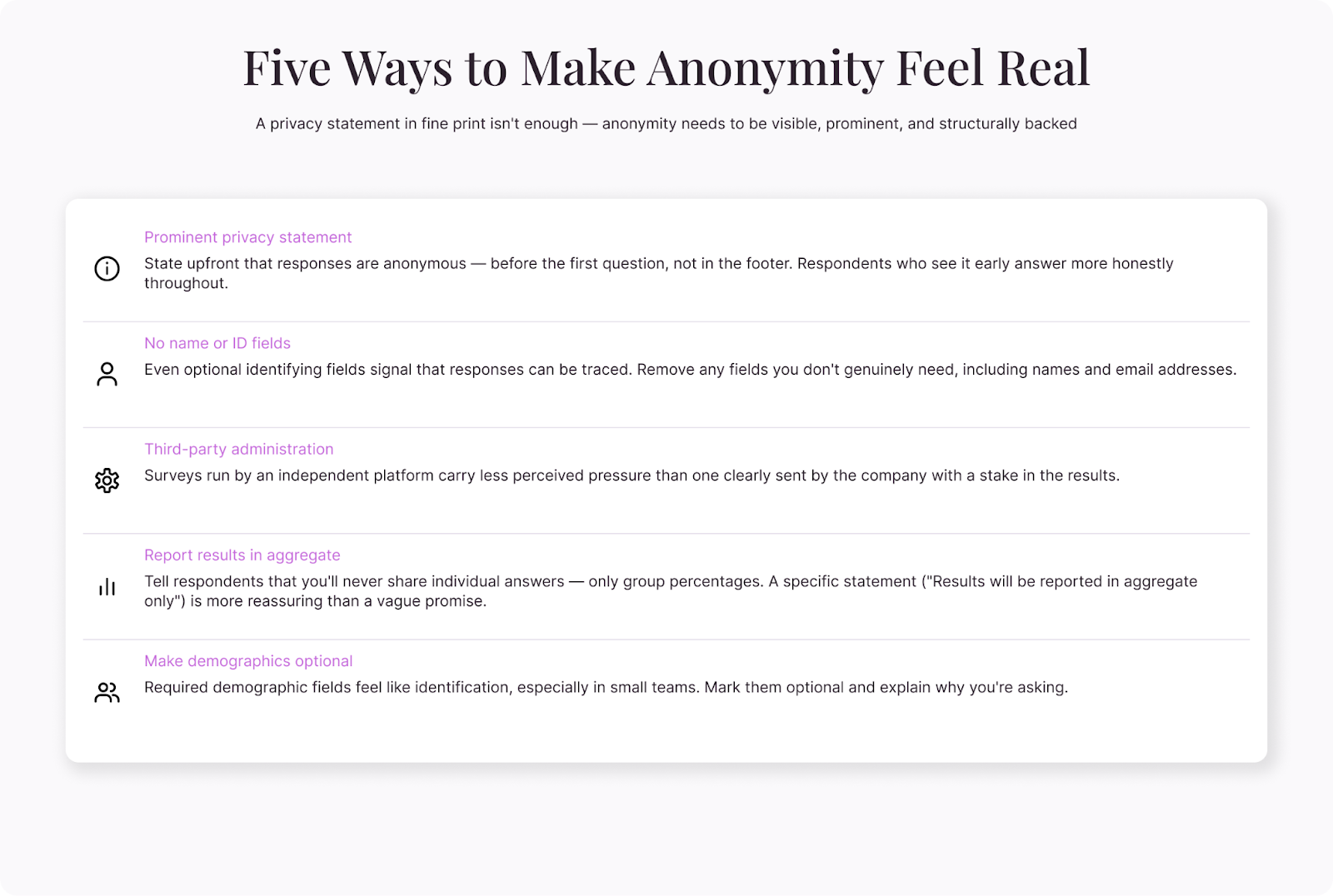 Don't just promise anonymity in fine print. Make it prominent. Explain it at the beginning of the survey. And back it up structurally—don't collect identifying information unless you absolutely need it, and separate demographic data from sensitive responses when possible.