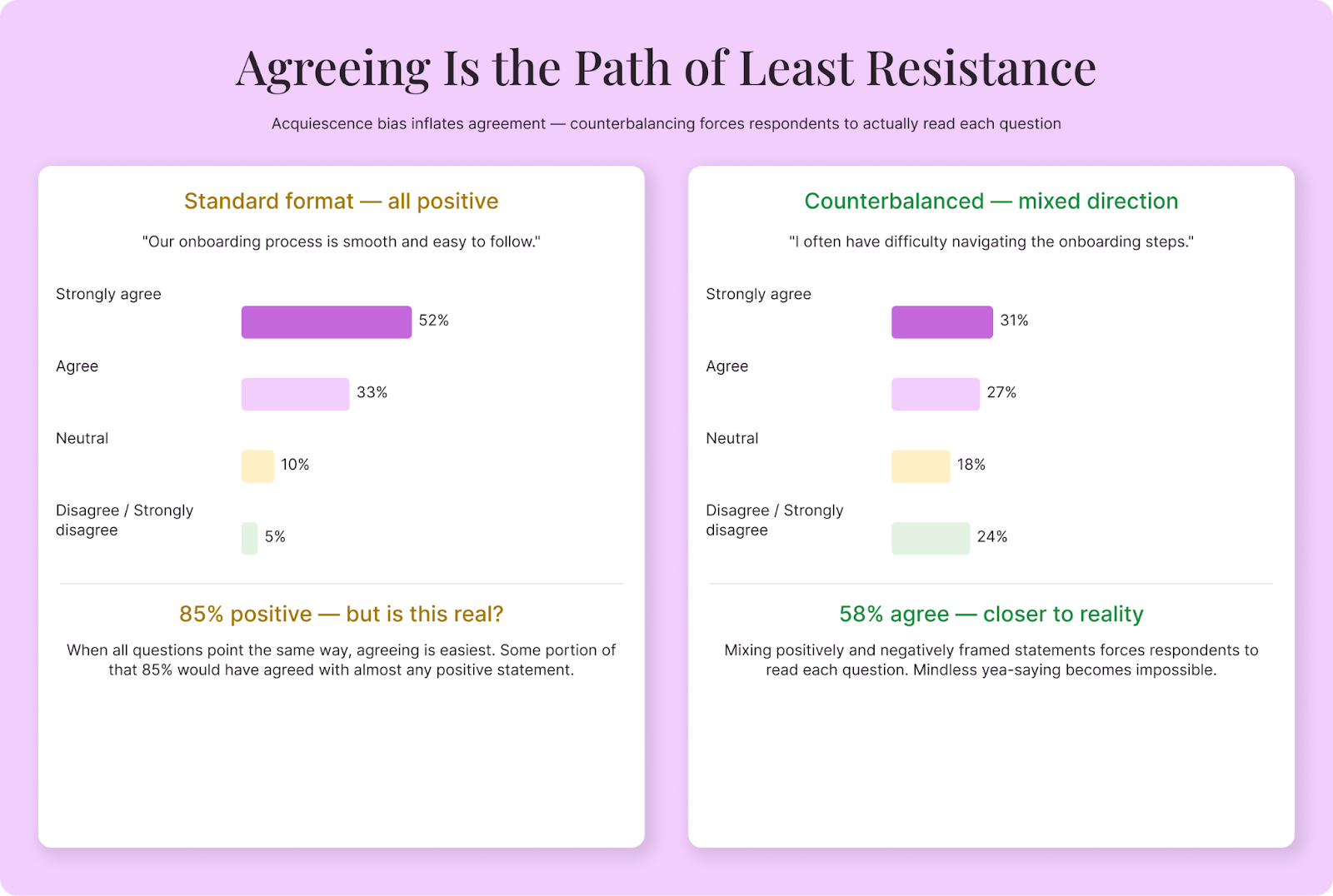 The result is data that skews positive, which feels good when you're reading it but doesn't reflect reality. If 85% of respondents "agree" that your onboarding process is smooth, but 40% of them would have agreed with any positive statement you put in front of them, that 85% doesn't mean what you think it means.