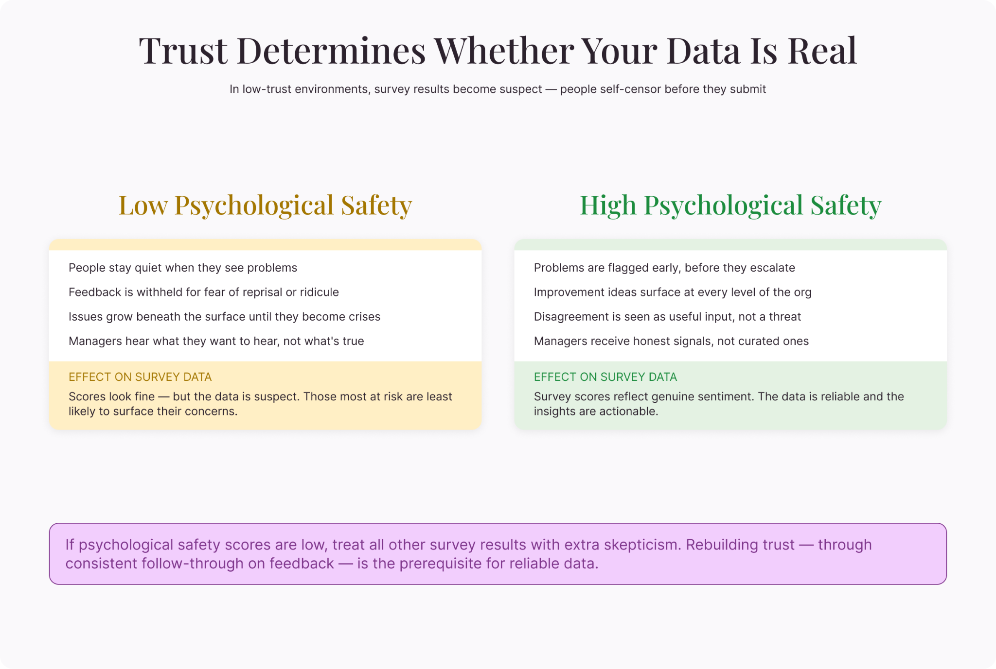 This is a trust barometer. In high-trust environments, people speak up when they see problems, suggest improvements without fear of reprisal, and flag risks early. In low-trust environments, they stay quiet—and problems grow until they become crises.