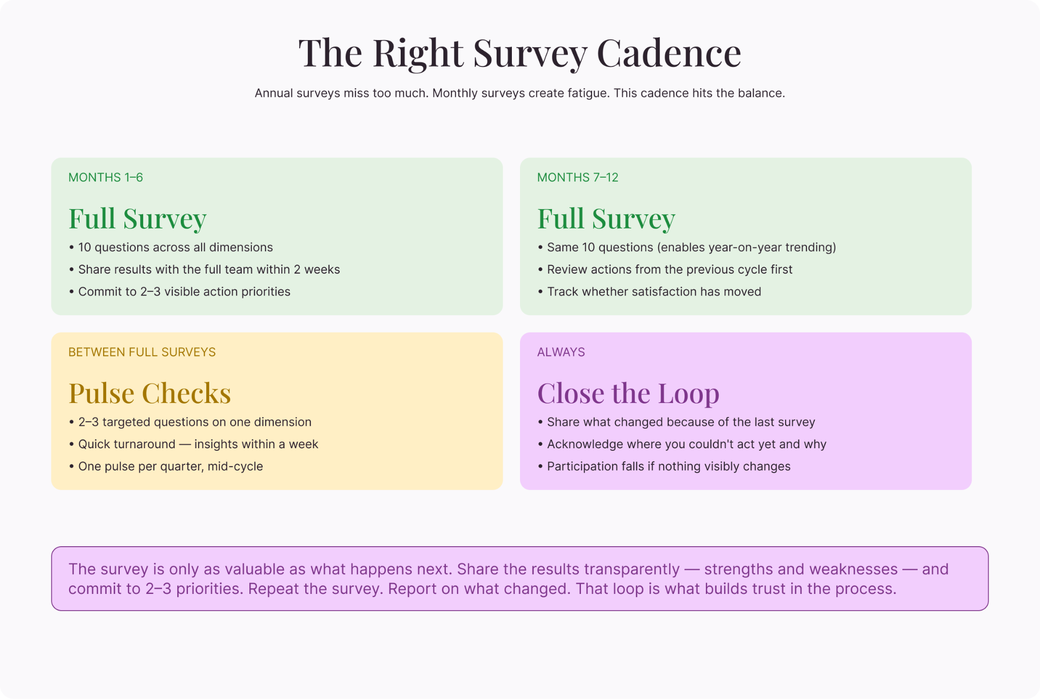 Survey regularly, but not too often. Annual surveys miss too much. Monthly surveys create fatigue. Biannual surveys (with shorter pulse checks in between) strike the right balance for most organizations.