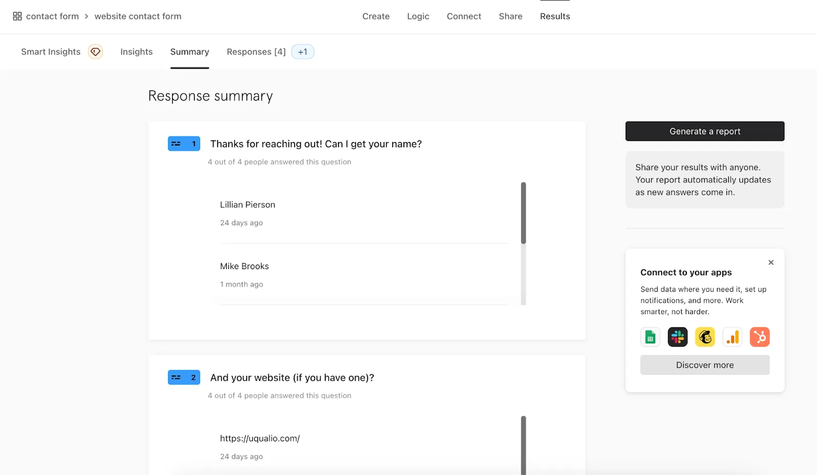 Tally offers fundamental survey data but lacks the depth of our analytics tools, like drop-off rates or campaign tracking. It has limited native analytic features, making it hard to derive rich insights from the data. You can only generate reports through third-party integrations, like Google Analytics.