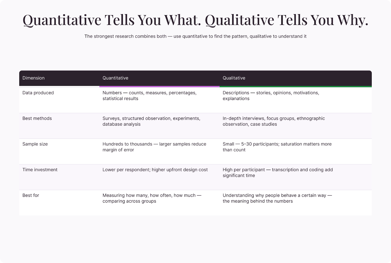 Not every technique fits every question. Surveys are great for measuring how widespread an opinion is, but terrible for understanding why someone holds it. Interviews reveal motivation and context, but can't tell you whether those motivations are common across your audience.