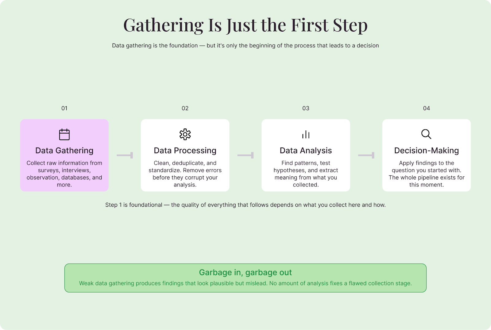 But here's where many people trip up: data gathering isn't the same as data analysis. Gathering is about collection—getting the raw material. Analysis is what you do with it afterward. Conflating the two leads to sloppy collection habits, because people rush to the "interesting" part without building a solid base.
