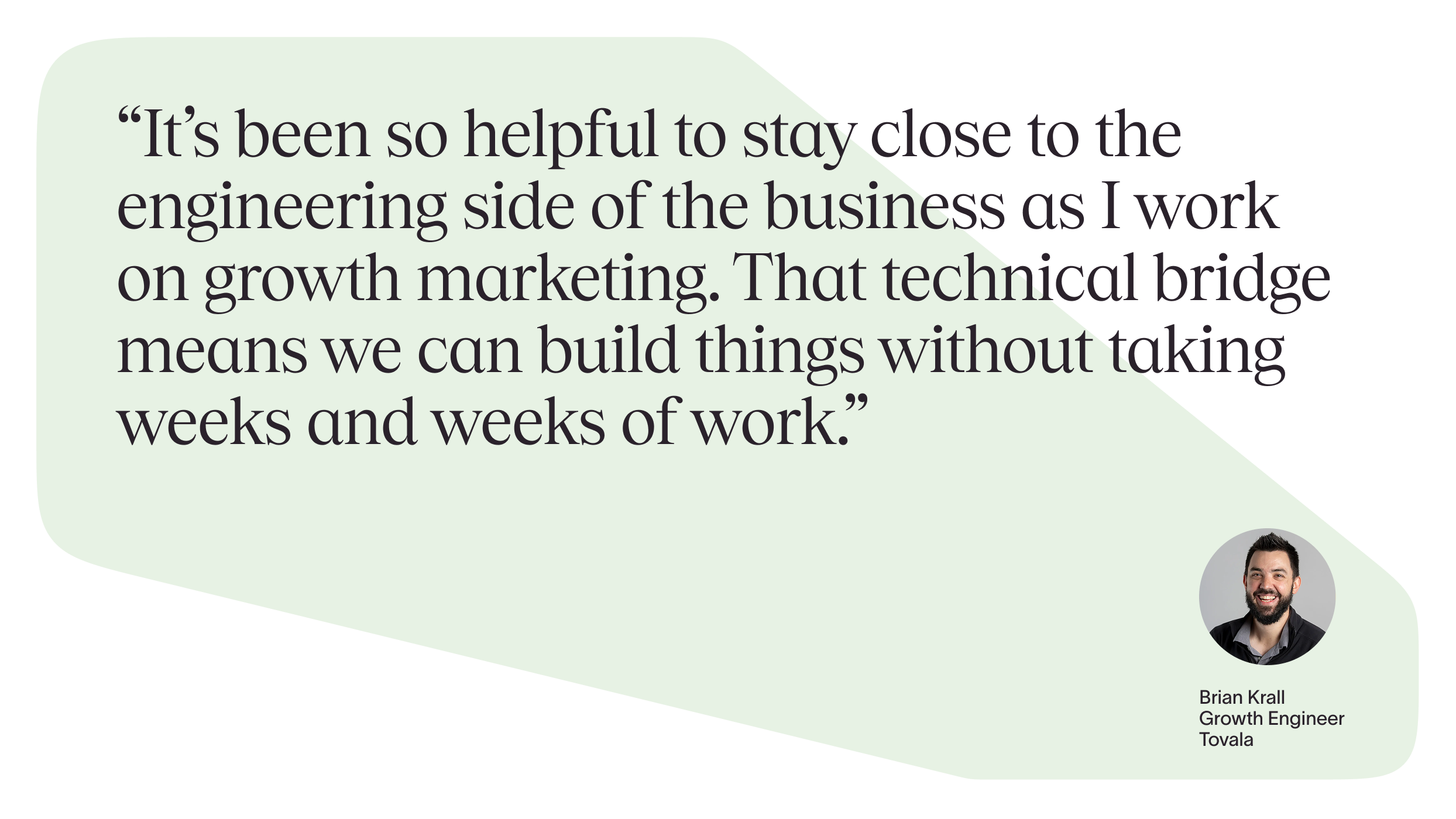 The most cross-functional team at Tovala is the conversion rate optimization (CRO) team, which brings together folks from design, UX, engineering, and data each week to plan sprints and build experiments.“It’s been so helpful to stay close to the engineering side of the business as I work on growth marketing,” says Brian. “That technical bridge means we can build things without taking weeks and weeks of work.”(ICYMI: We wrote about how to wrangle a cross-functional marketing project here.)