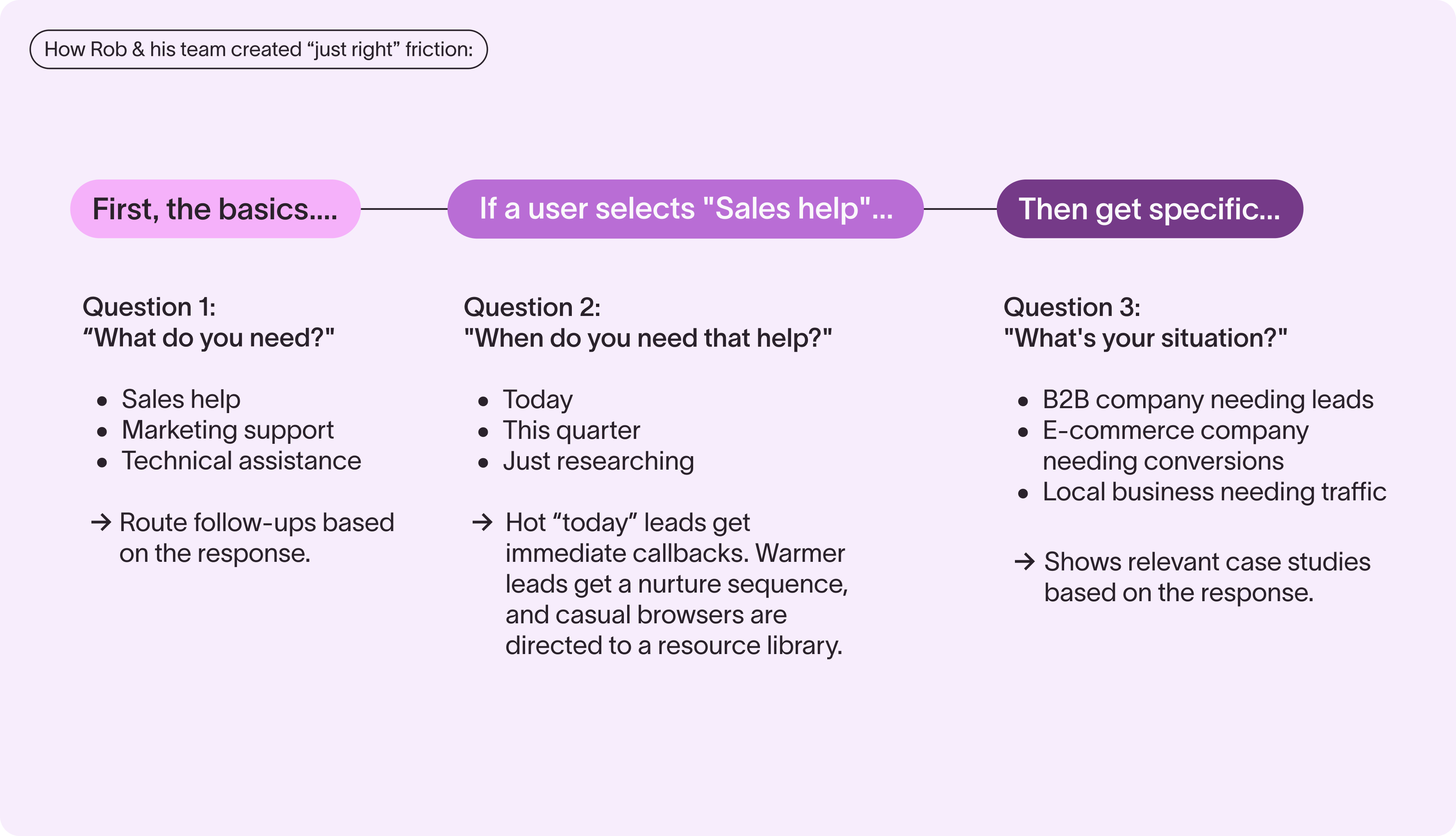 Pick one high-value conversion point (a demo request, pricing page visits, a free trial signup). Then add one behavioral qualifying question (like Denim’s “When do you need help?”).Test for two weeks to see the impact on your lead gen machine.