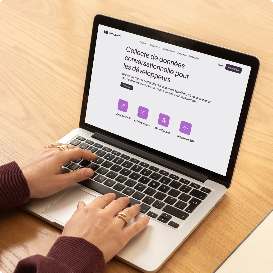 Accédez aux API ouvertes et au portail des développeurs de Typeform pour créer des intégrations puissantes qui débloquent de nouveaux flux de travail, de nouvelles stratégies et un moyen plus rapide de créer de la valeur pour vos clients.