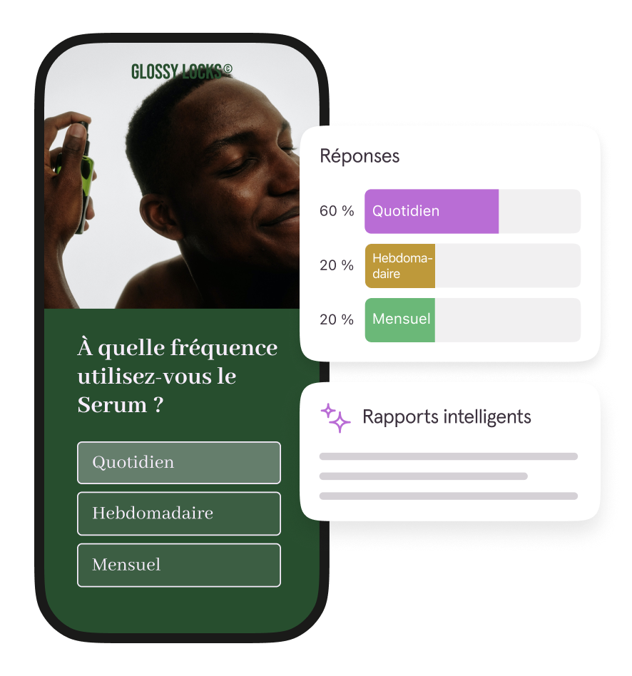 Heureusement, Typeform est là. Notre logiciel d'études de marché vous aide à collecter des études de marché de haute qualité grâce à des enquêtes entièrement personnalisables et conversationnelles qui maintiennent l'engagement des participants au panel. Et nos outils d'analyse d'études de marché utilisent l'IA pour vous aider à découvrir plus rapidement de précieux insights sur les clients.