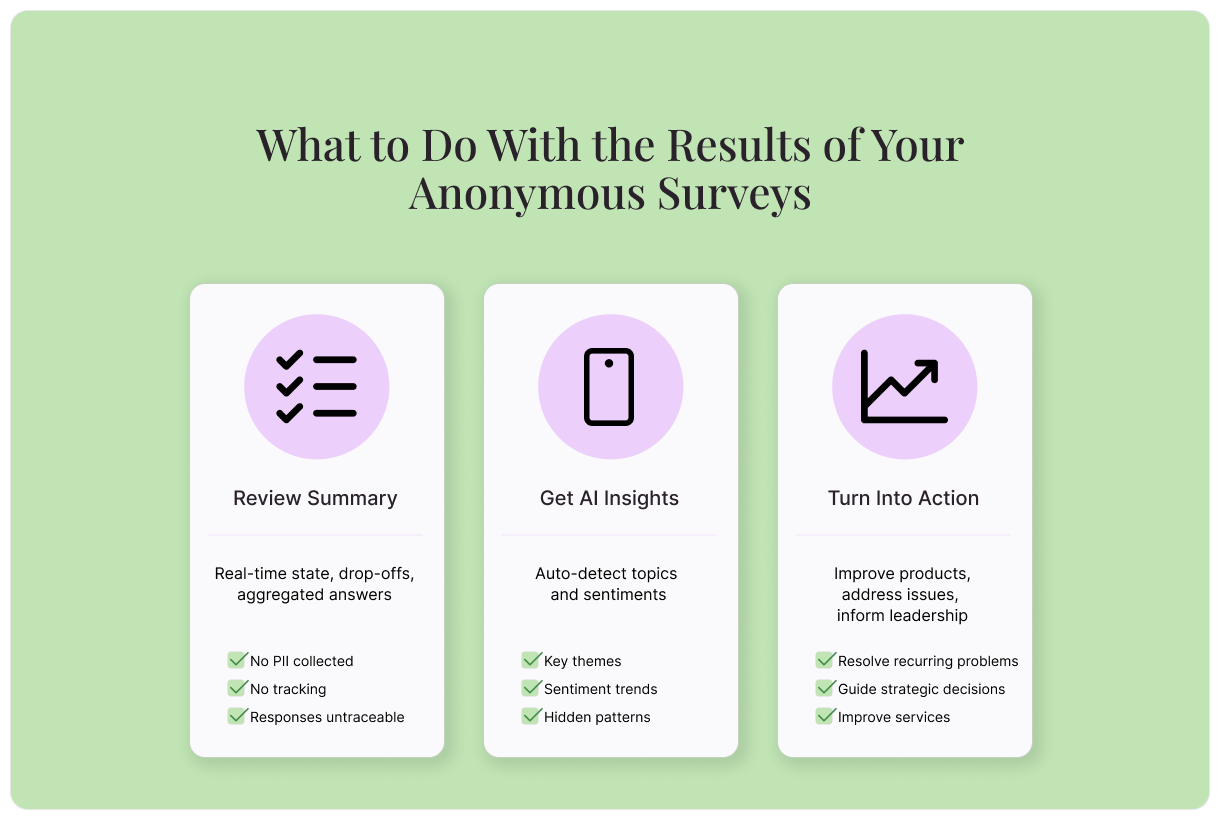 Anonymous surveys generate higher participation rates and collect more honest feedback by removing a key barrier: the fear of being identified. By omitting personally identifying information like names, contact information, and IP address, anonymous surveys create a space where people can respond honestly and openly. When people trust that their privacy is protected, they’re much more likely to share what they really think.