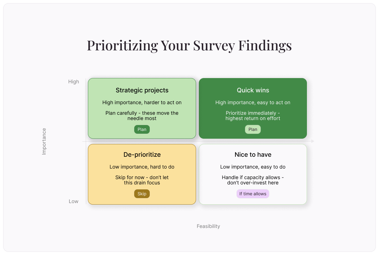 Not every insight requires action. Focus on findings that are both important (they affect revenue, retention, or growth) and actionable (you can actually do something about them). Here’s a useful framework: Plot findings on a two-by-two matrix of importance versus feasibility and focus on the high-importance quadrants.