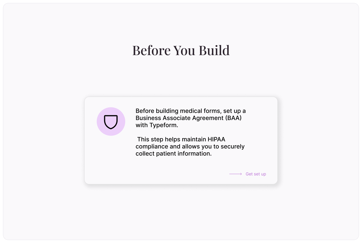Before building any medical forms with Typeform, you’ll need to set up a Business Associate Agreement (BAA) with us. This agreement helps you stay HIPAA compliant. Fill out this Typeform or contact your Typeform account manager to set up your BAA.