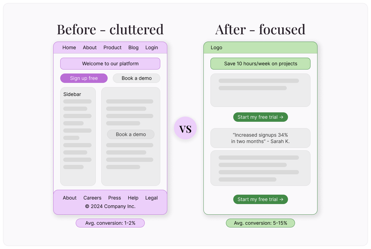 Every link that isn't your CTA is a potential exit. Remove navigation bars, footer links, and sidebar widgets. The only clickable elements should be your CTA and any essential legal links (privacy policy, terms).